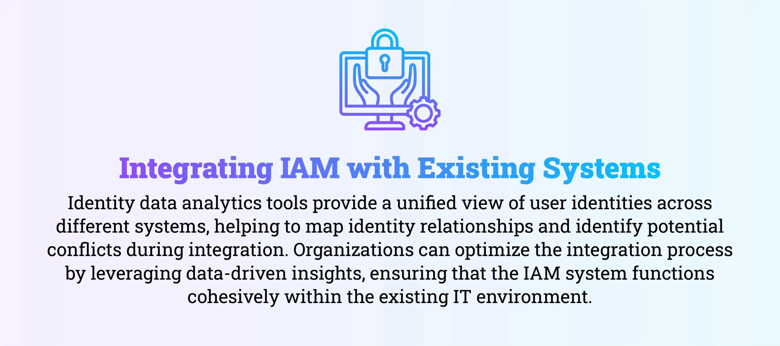 Identity data analytics tools provide a unified view of user identities across different systems, helping to map identity relationships and identify potential conflicts during integration. Organizations can optimize the integration process by leveraging data-driven insights, ensuring that the IAM system functions cohesively within the existing IT environment.