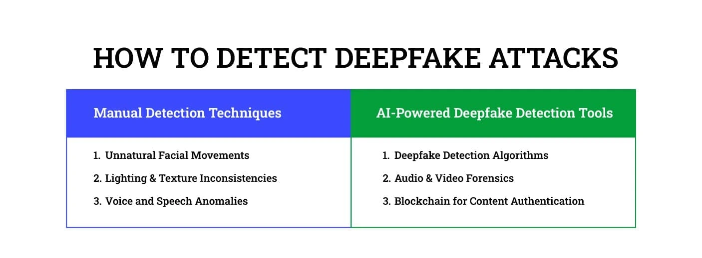 With deepfakes becoming increasingly realistic, detection requires both human observation and advanced AI-driven tools. Recognizing deepfakes can be challenging, but a combination of manual detection techniques and AI-powered deepfake detection methods helps in identifying these cyber threats.