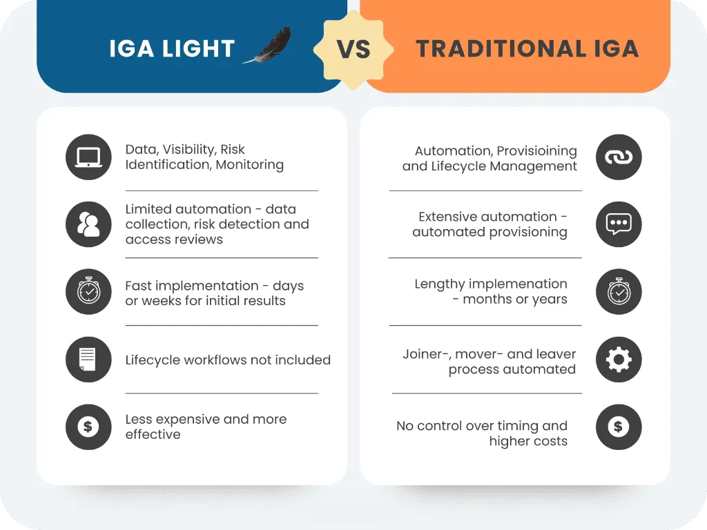 - Unlike traditional IGA solutions that take months to implement, IGA Light can be deployed in days or weeks.