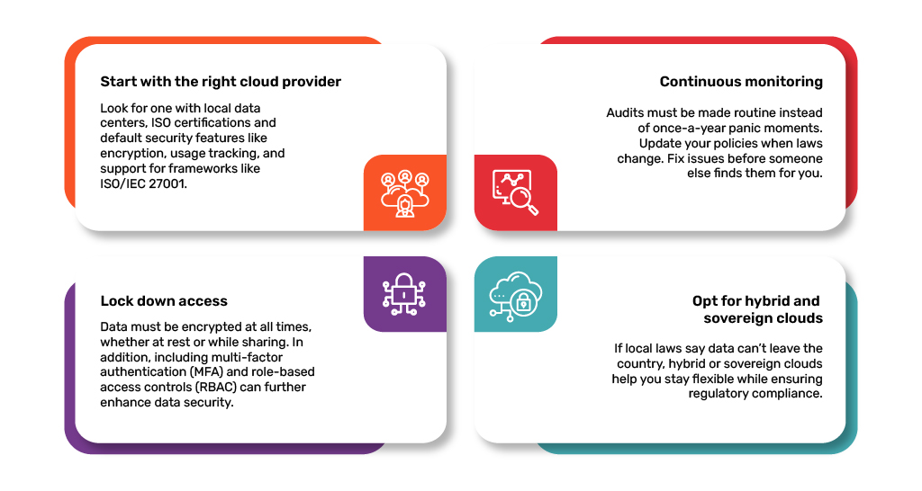 - Start with the right cloud provider: Look for one with local data centers, ISO certifications and default security features like encryption, usage tracking, and support for frameworks like ISO/IEC 27001.